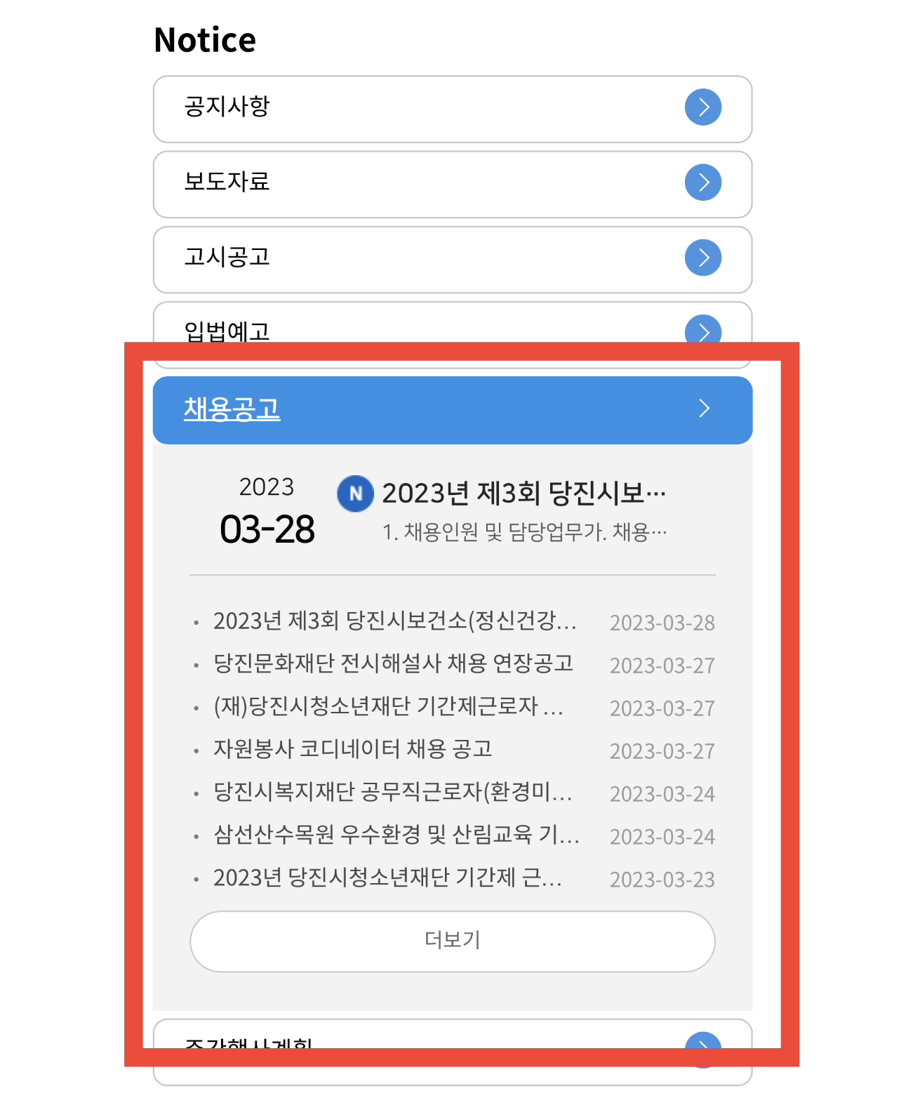 그러면 사진과 같이 채용공고 소식을 알 수 있는데 이를 통해서 공무직근로자, 기간제근로자, 각종 업종 채용공고 소식을 한눈에 알 수 있습니다.
