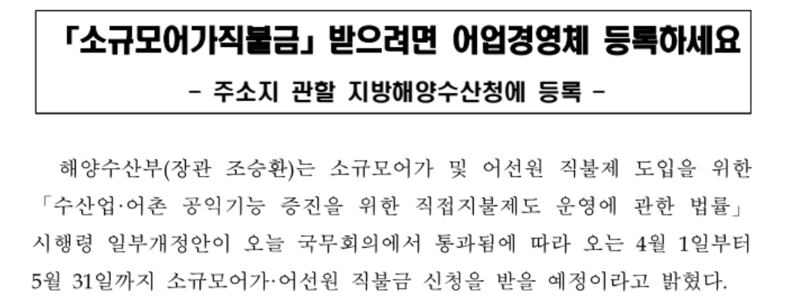 소규모어가와 어선원 직불금 신청과 관련된 자세한 방법은 동법 시행규칙이 확정되는 3월 말 이후에 지자체·수협·언론 등을 통해 추가적으로 안내될 예정이라고 전했습니다.