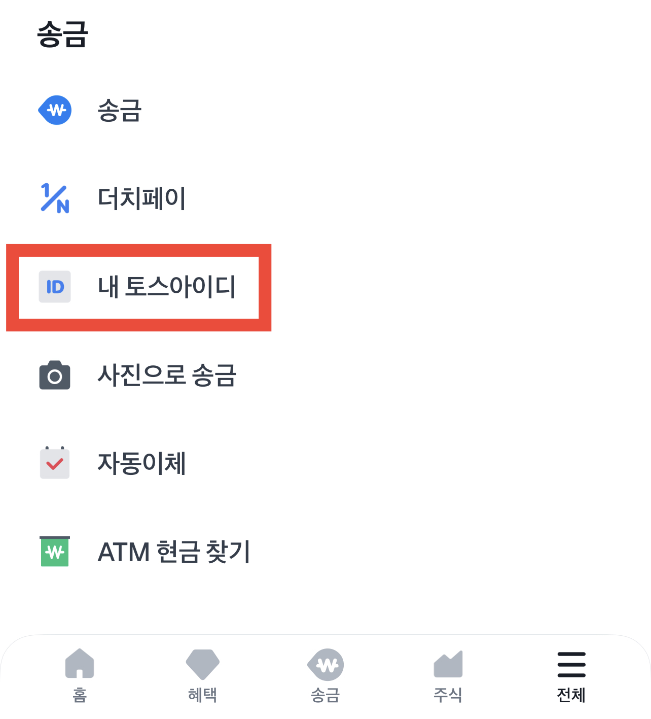토스 앱을 접속하신 후에 하단애 전체 메뉴 클릭 후 송금메뉴에 “내 토스 아이디”가 있는데 클릭해주시길 바랍니다.