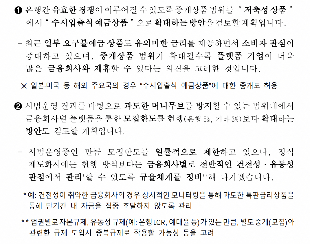 ➋ 시범운영 결과를 바탕으로 과도한 머니무브를 방지할 수 있는 범위내에서 금융회사별 플랫폼을 통한 모집한도를 현행(은행 5%, 기타 3%)보다 확대하는 방안도 검토할 계획