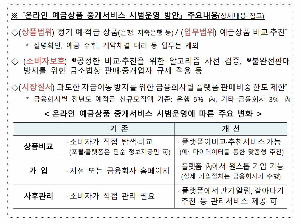 실제 온라인 예금상품 중개서비스가 출시되면 소비자 편익, 금융시장 안정 등 측면을 종합적으로 점검하여 정식 제도화를 검토하겠다고 합니다.