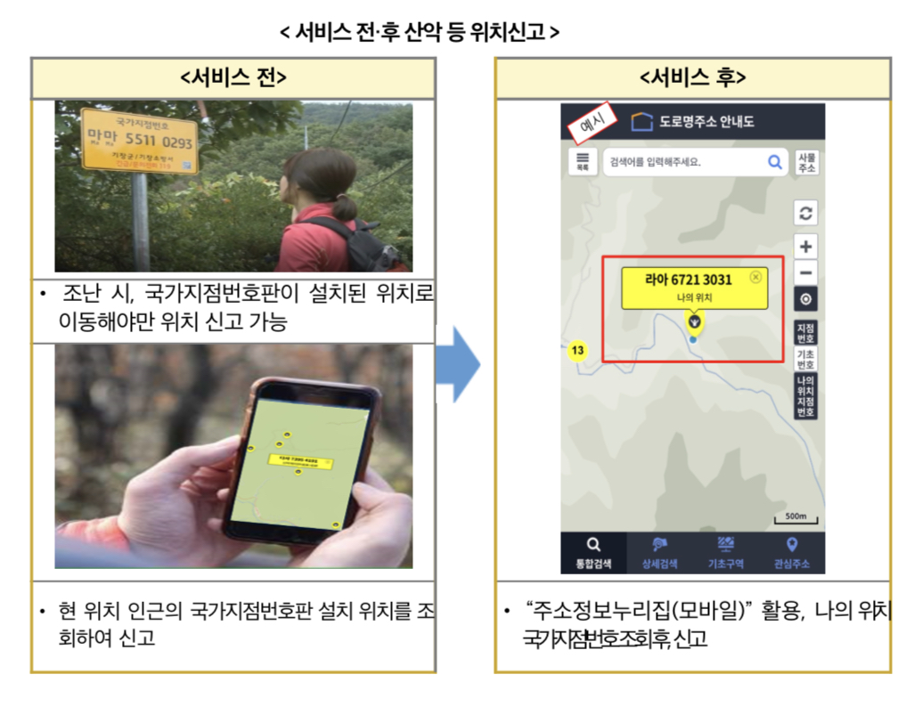 행정안전부에서는 앞으로는 주소정보누리집(모바일)에서 현 위치(30m×30m 격자)의 국가지점번호 확인이 가능해짐에 따라 정확한 위치 신고를 할 수 있게 된다고 합니다.