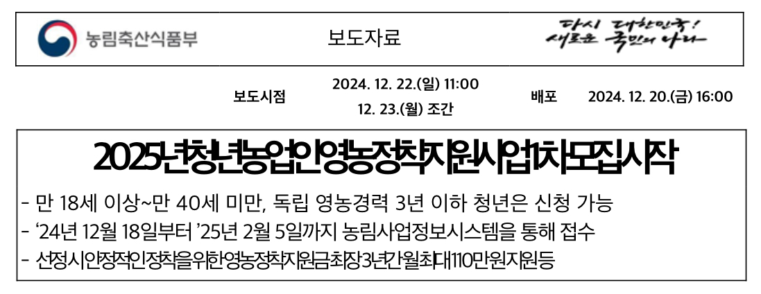 농림축산식품부(장관 송미령, 이하 농식품부)는 2024년 12월 18일(수)부터 「2025년 청년농업인 영농정착지원사업」 대상자 선발을 위한 1차 모집을 시작했다고 합니다.