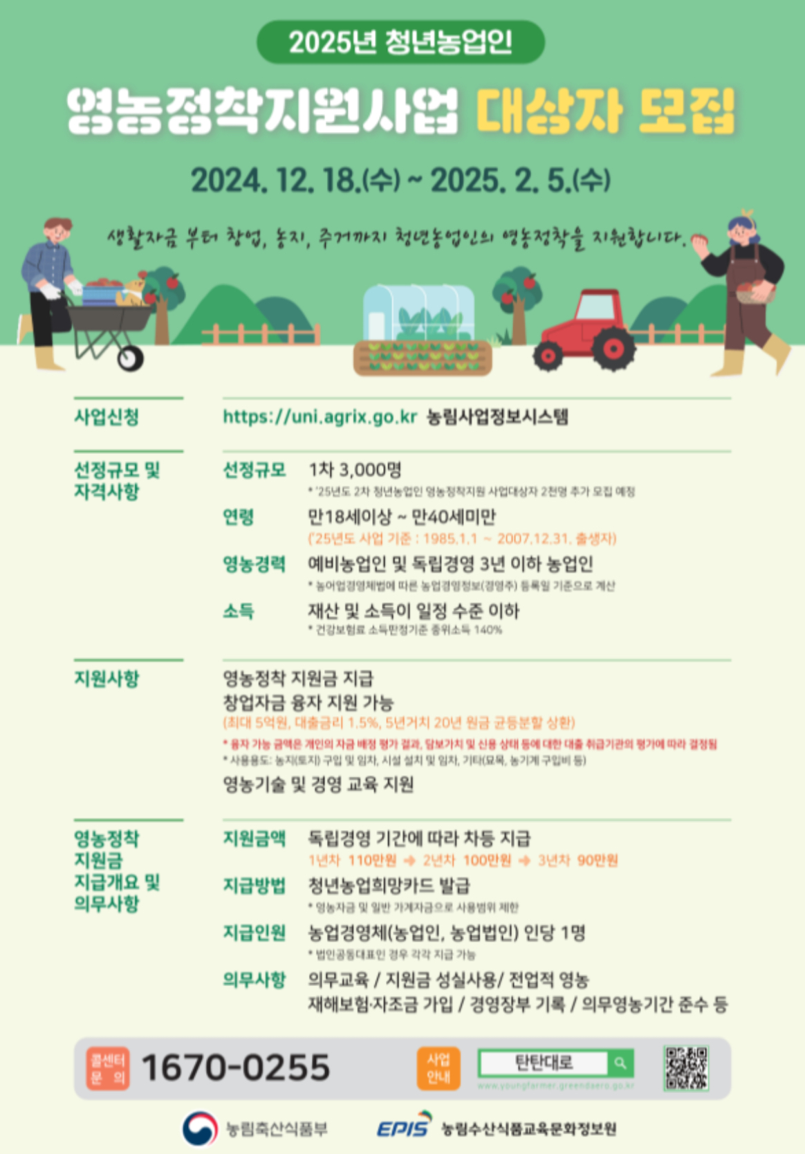 사업 지침과 관련 정보는 ‘탄탄대로’(youngfarmer.greendaero.go.kr)에서 확인할 수 있으며, 궁금한 사항은 청년농업인 안내 콜센터(1670-0255)로 문의하면 된다고 합니다.