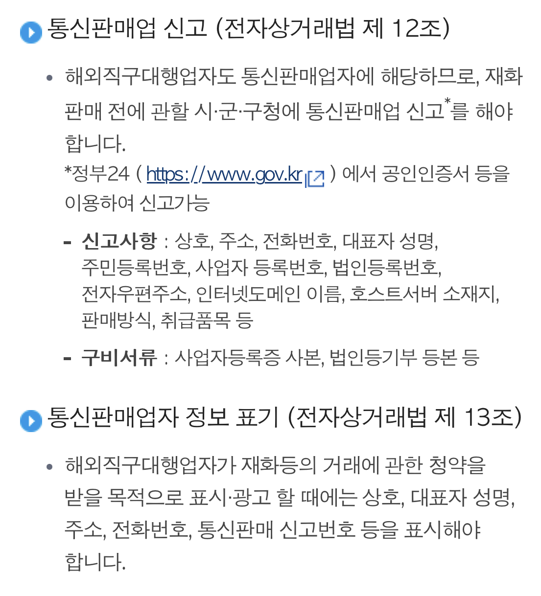 • 해외직구대행업자도 통신판매업자에 해당하므로, 재화 판매 전에 관할 시·군·구청에 통신판매업 신고*를 해야 합니다.