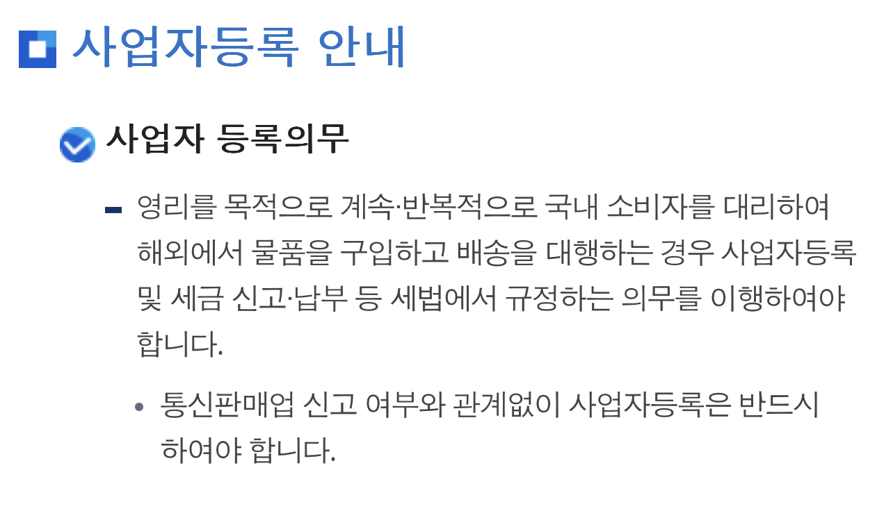 - 영리를 목적으로 계속·반복적으로 국내 소비자를 대리하여 해외에서 물품을 구입하고 배송을 대행하는 경우 사업자등록 및 세금 신고·납부 등 세법에서 규정하는 의무를 이행하여야 합니다.
