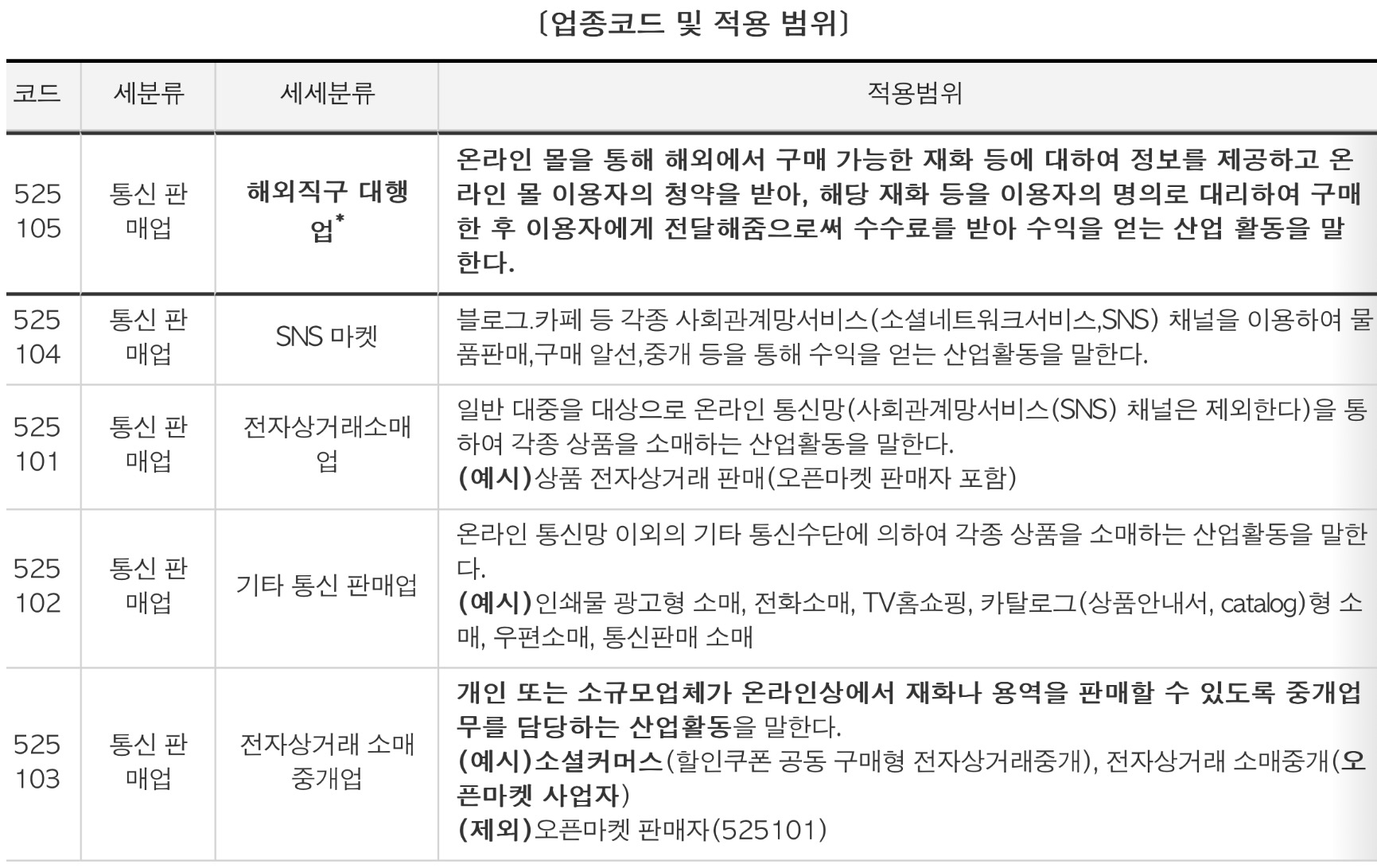 * 일반 전자상거래 소매 및 전자상거래 소매 중개(오픈마켓사업자)업종과 구분하기 위해 2020년도에 해외직구대행업 업종코드 신설