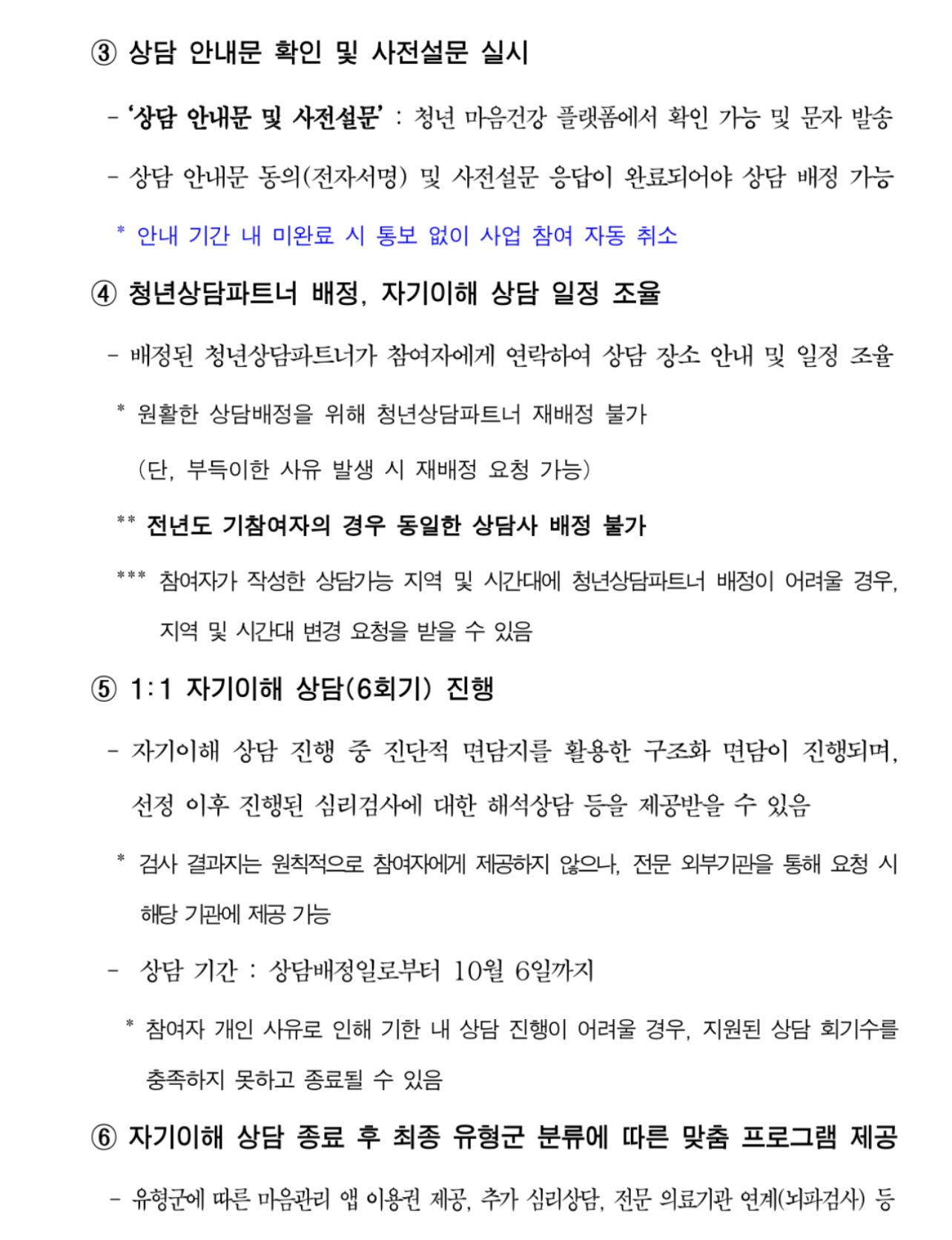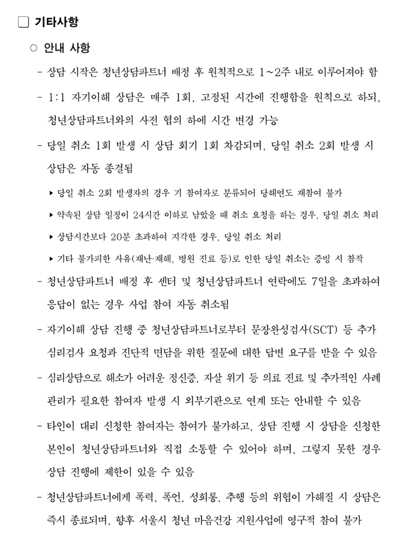 선정된 참여자들은 온라인 검사를 통한 과학적 진단 후, 개인별 맞춤 심리상담을 최소 6회 이상 받게 되며 상태에 따라 최대 10회까지 상담이 가능하고 서울시는 이를 위해 간이성격진단검사 'KSCL95'와 기질 및 성격검사 'TCI'를 활용한다고 합니다.