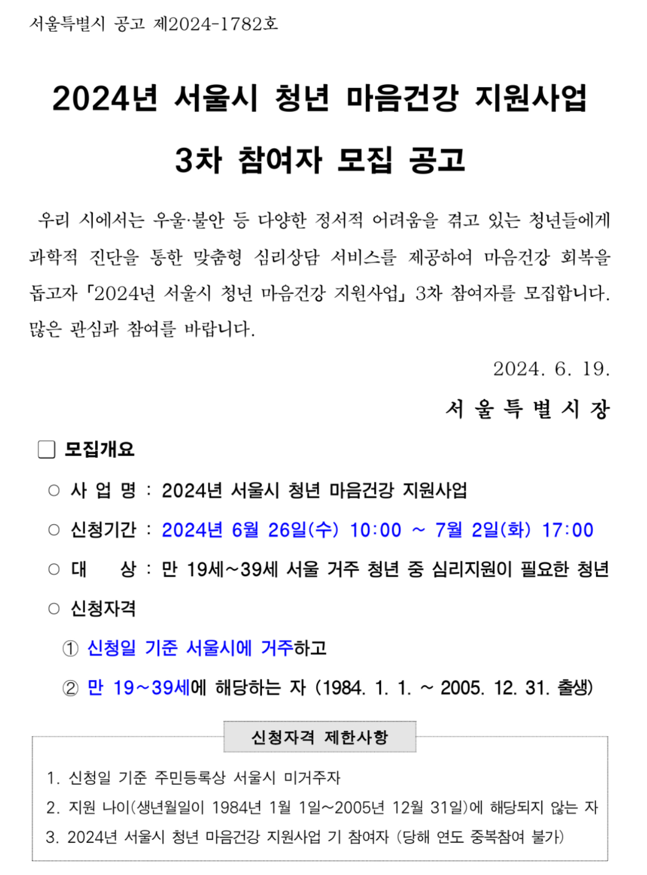 '서울시 청년 마음건강 지원사업'이 2024년 올해 세 번째 참여자를 모집함으로써, 전문적인 상담과 맞춤형 프로그램을 지원한다고 합니다.
