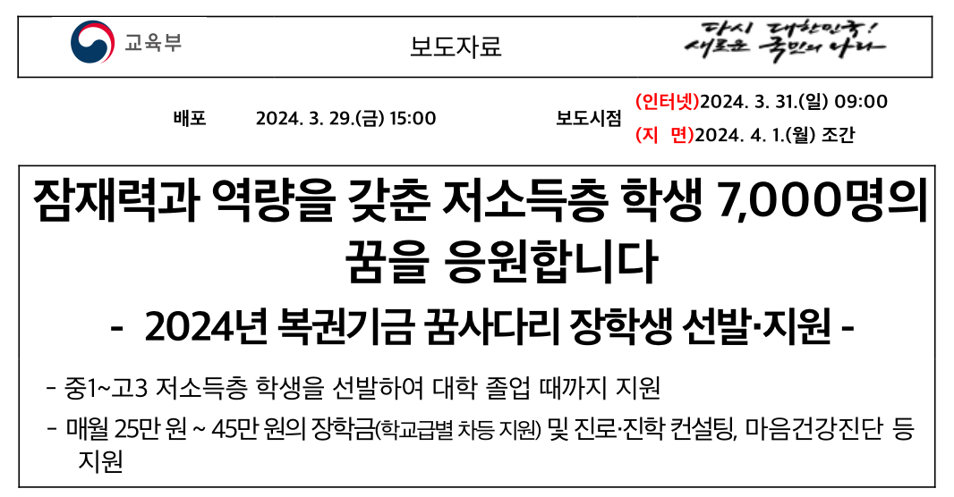 교육부(부총리 겸 교육부장관 이주호)와 한국장학재단(이사장 배병일)은 올해 7,000명의 저소득층 학생들에게 복권기금 꿈사다리 장학금을 지원한다고 합니다.