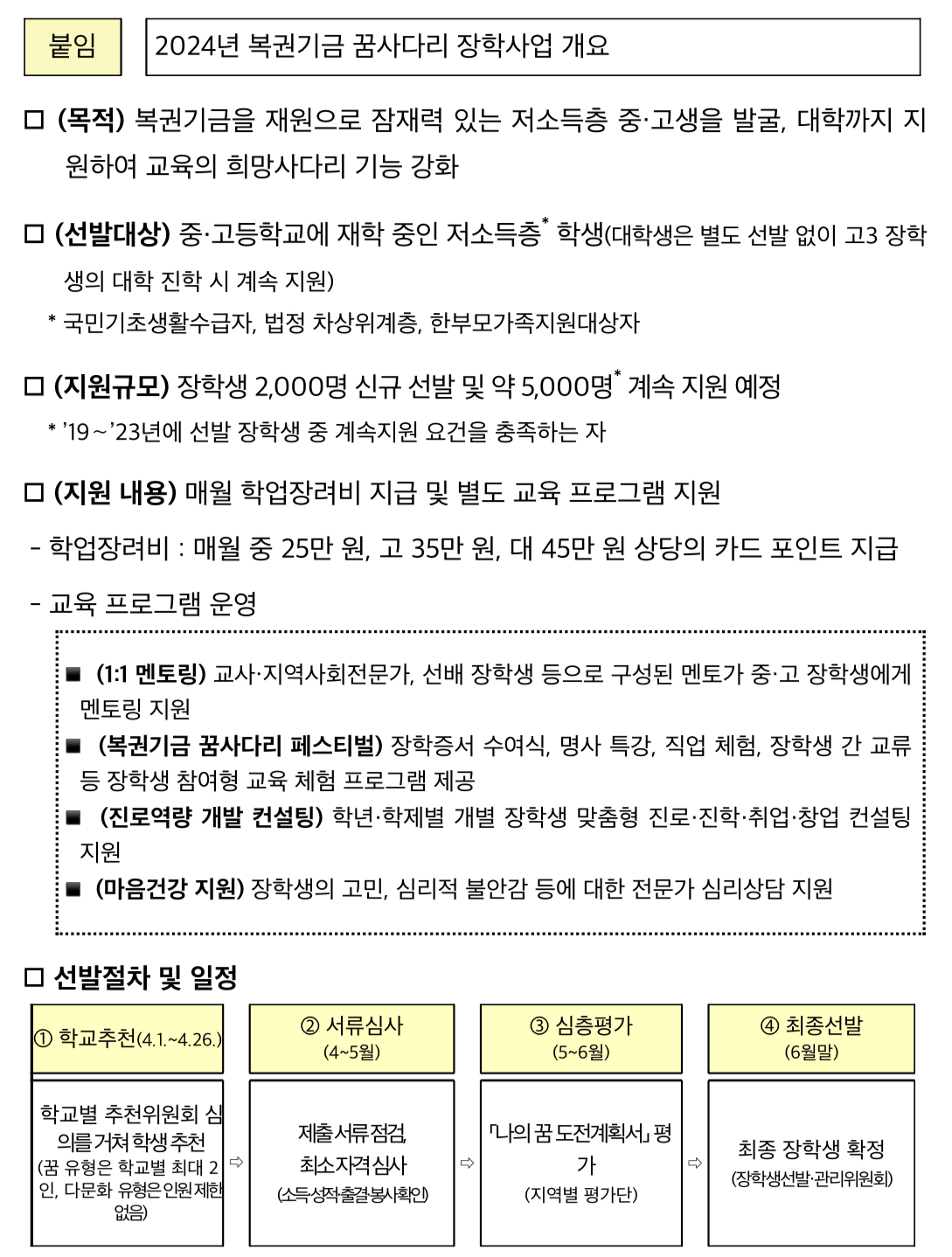 2019년부터 시작된 복권기금 꿈사다리 장학금은 잠재력 있는 저소득층 중‧고등학생을 조기에 선발하여 대학까지 연계 지원하는 국가 장학사업으로 2024년에는 꿈 장학금과 다문화 장학금의 2가지 유형으로 운영된다고 합니다.