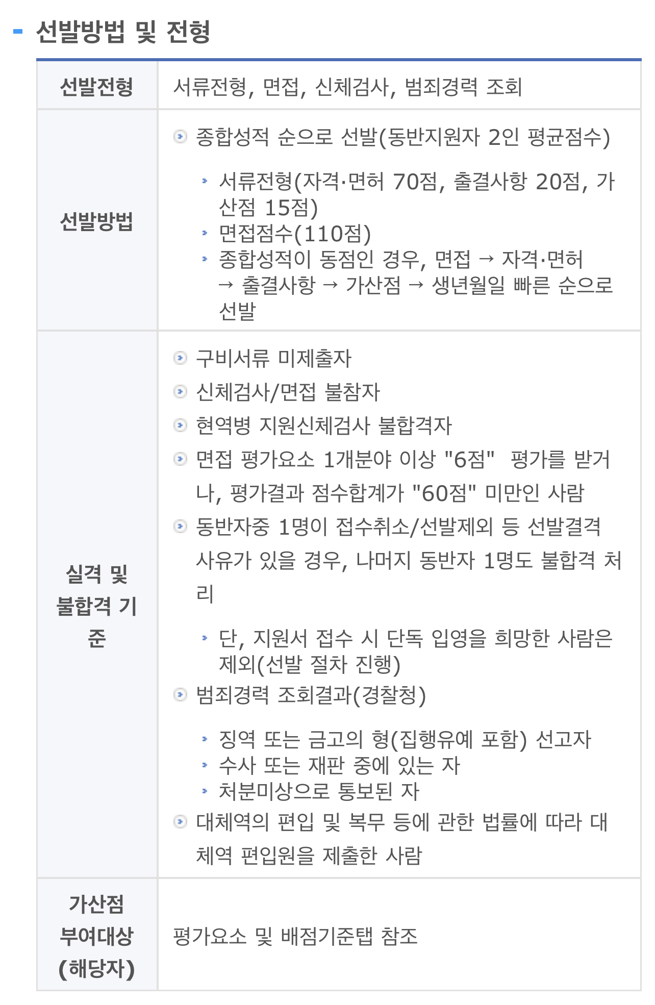 - 종합성적이 동점인 경우, 면접 → 자격·면허 → 출결사항 → 가산점 → 생년월일 빠른 순으로 선발