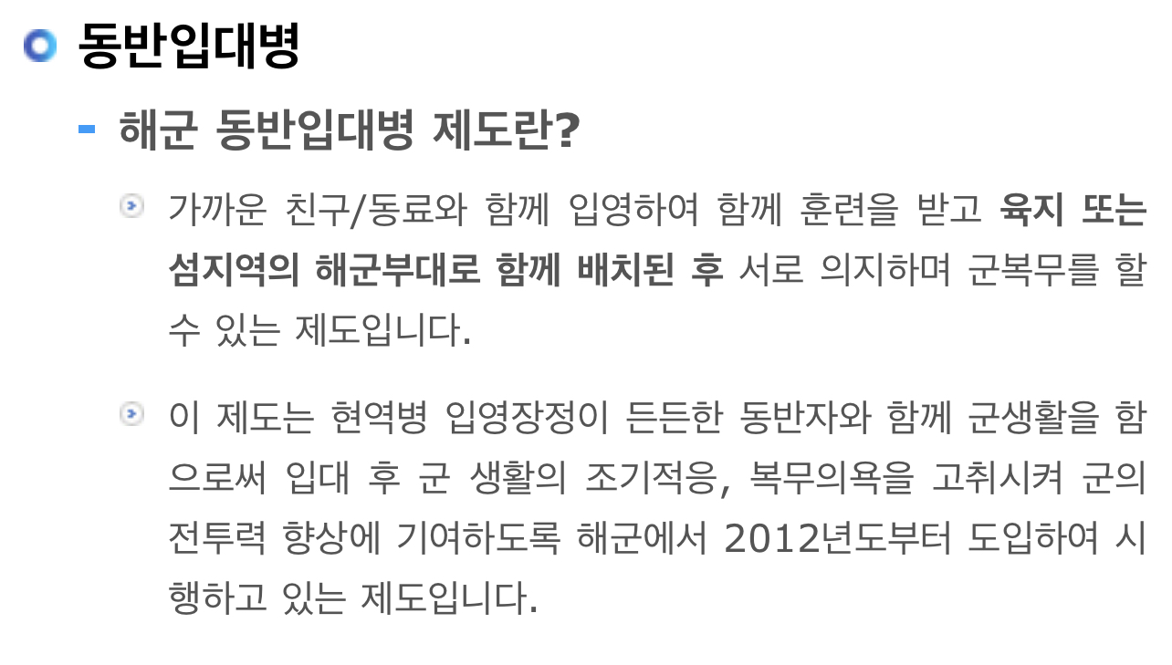 해군 동반입대병 제도란 가까운 친구/동료와 함께 입영하여 함께 훈련을 받고 육지 또는 섬지역의 해군부대로 함께 배치된 후 서로 의지하며 군복무를 할 수 있는 제도입니다.