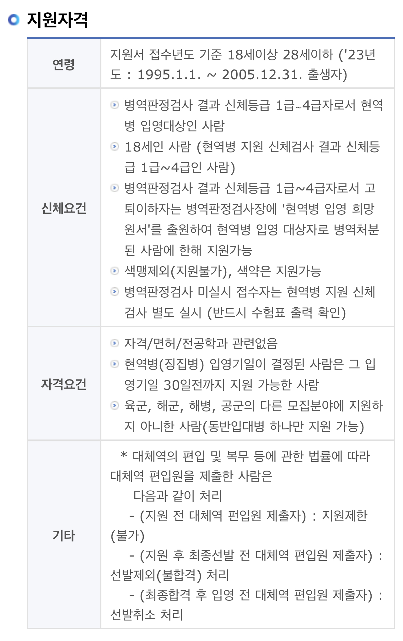 ▶병역판정검사 결과 신체등급 1급~4급자로서 고퇴이하자는 병역판정검사장에 '현역병 입영 희망원서'를 출원하여 현역병 입영 대상자로 병역처분된 사람에 한해 지원가능