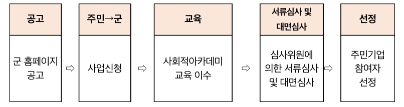 ※ 2023년 주민기업 육성사업 공모 신청자만이 2023년 사회적아카데미 교육에 참여 할 수 있는 자격 부여(공모 접수 →사회적아카데미 교육 참여 → 심사 참여 후 선정)