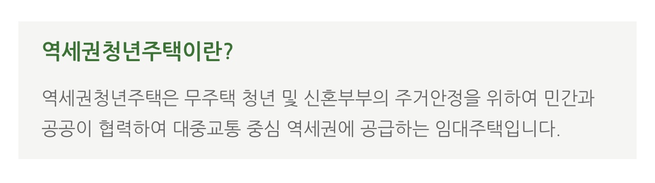 ‘역세권 청년주택’은 무주택 청년·신혼부부의 주거 안정을 위해 민간과 공공이 협력하여 대중교통 이용이 편리한 곳을 중심으로 공급하는 임대주택입니다.