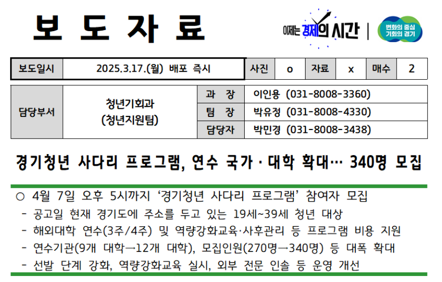 경기도와 경기도미래세대재단은 오는 2025년 4월 7일까지 미국 등 해외대학 연수 기회를 제공하는 ‘경기청년 사다리 프로그램’ 참여자 340명을 모집한다고 합니다.