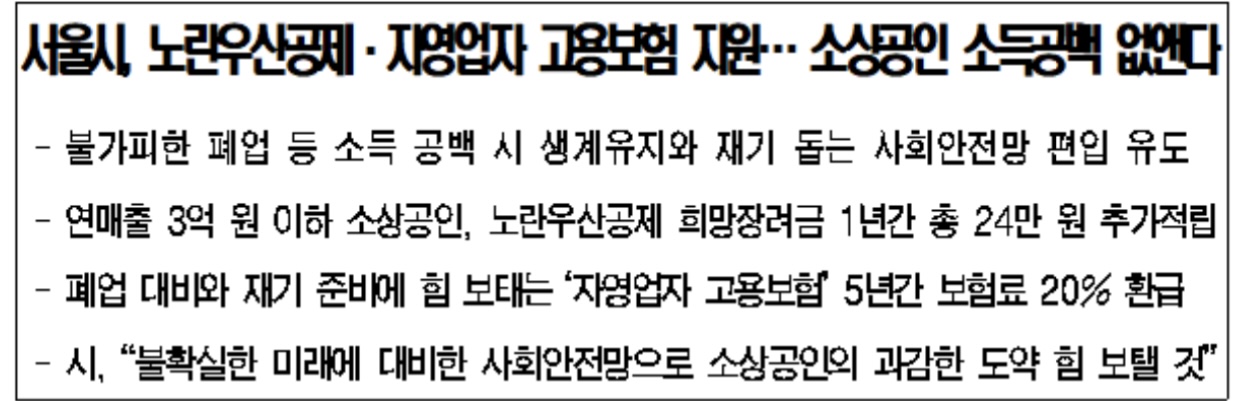 서울시가 폐업이나 재난, 질병·부상 등으로 영업이 불가능한 소상공인들의 소득 공백을 채워 생계유지를 돕는다고 밝혔습니다.