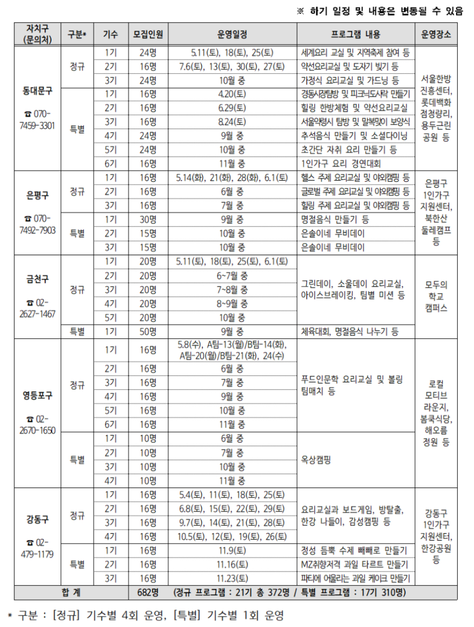 ➡️강동구는 요리교실과 함께 보드게임, 방탈출, 한강 나들이, 감성캠핑 등 다채로운 소통 프로그램으로 구성된 정규 프로그램을 5월, 6월, 9월, 10월에 각각 진행하며, 11월에는 MZ세대의 취향을 저격하는 디저트 만들기 특별프로그램을 진행할 예정