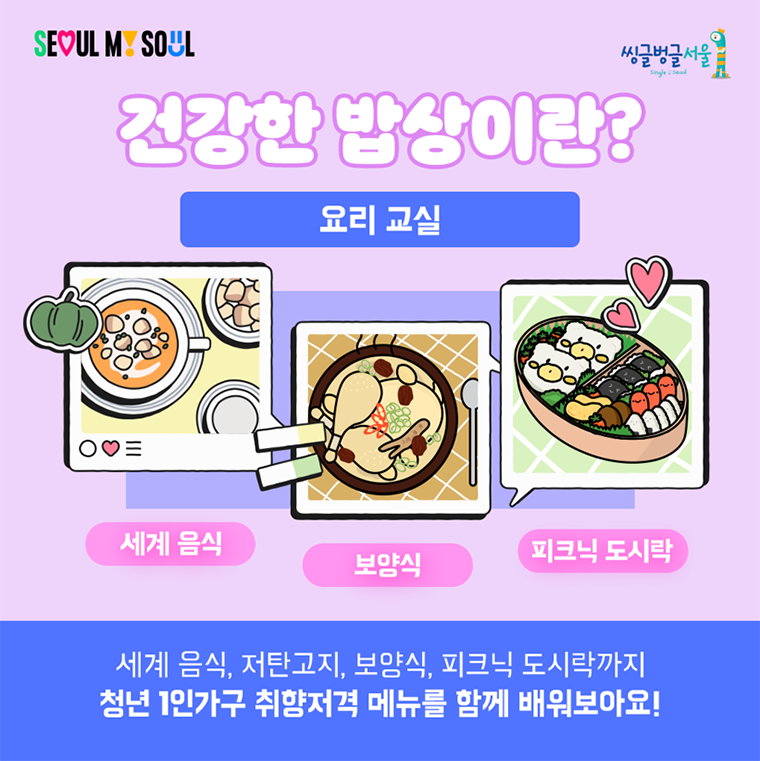 ‘건강한 밥상’은 끼니를 거르거나 인스턴트와 배달음식에 익숙한 청년 1인가구를 위해 서울시가 지난해부터 시작한 사업으로, 건강한 식습관 지원을 위한 ‘요리교실’과 사회관계망 형성을 위한 ‘소통 프로그램’으로 구성된다고 합니다.