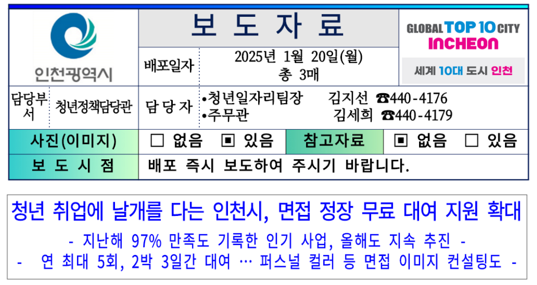 인천광역시(시장 유정복)는 2025년 1월 20일부터 청년 취업준비생의 경제적 부담을 줄이고 실질적인 구직 활동을 지원하는 ‘드림나래(인천청년 면접복장 지원)’ 사업을 확대 추진한다고 밝혔습니다.
