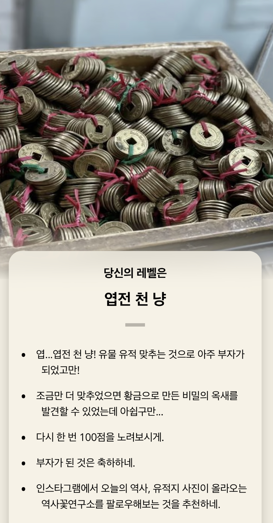 당신의 레벨은 엽전 천 냥이 나왔습니다.
