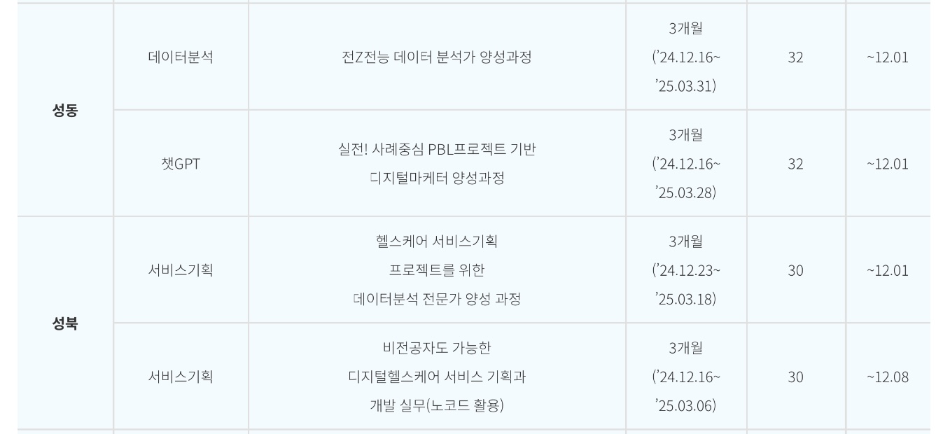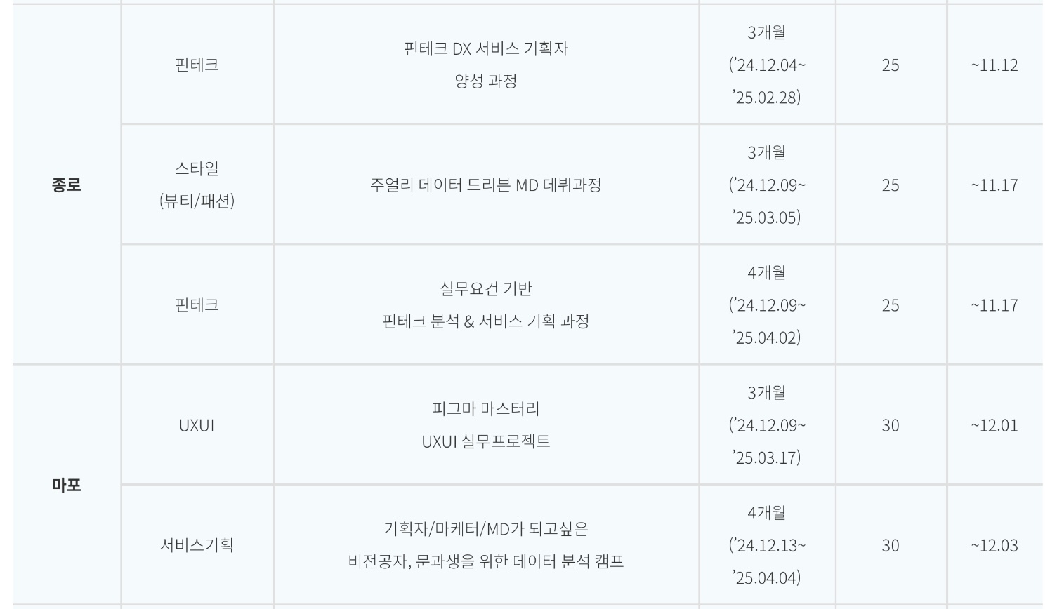 서울시가 문과 출신 비전공자 청년 등을 대상으로 한 디지털 실무역량 교육과 빅데이터, 에듀테크 등을 배울 수 있는 겨울특강을 오는 12월 종로, 광진 등 청년취업사관학교 캠퍼스 10곳 및 세텍(SETEC) 컨벤션센터에서 개강한다고 합니다.