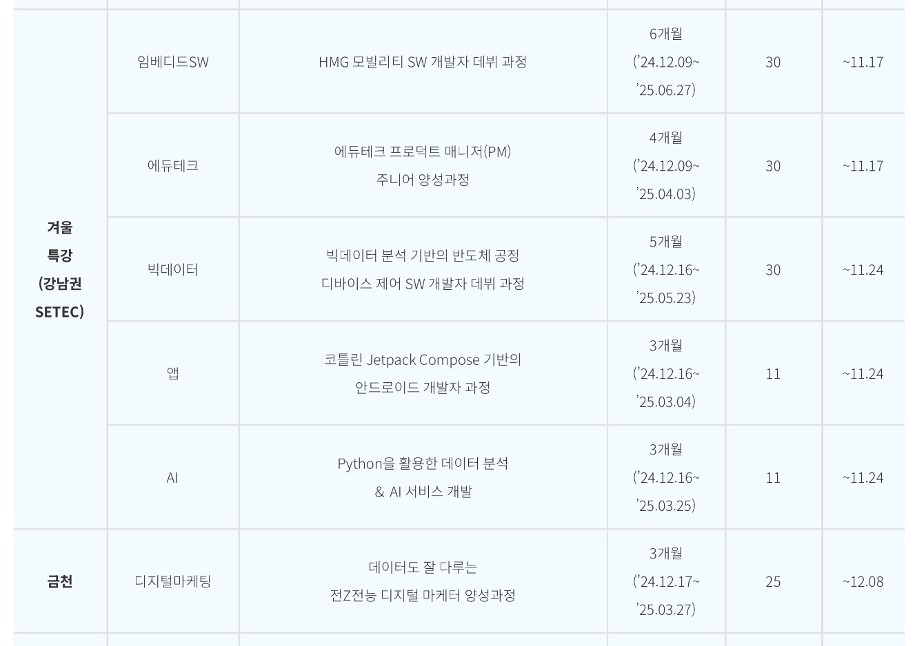 또한, 이번 겨울특강은 청년취업사관학교 캠퍼스가 없는 강남권 청년을 위해 세텍(SETEC)에서 ▴임베디드 SW ▴에듀테크 ▴빅데이터 ▴앱▴AI 등의 교육과정을 진행한다고 합니다.
