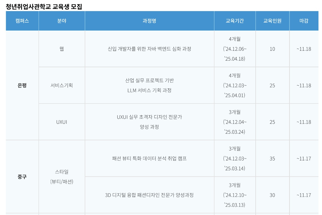 각 캠퍼스의 교육과정에 참여를 희망하는 서울시민은 청년취업사관학교 누리집을 통해 신청할 수 있는데 교육비는 무료이며, 해당 교육 분야의 기초지식과 면접을 거쳐 최종 교육생을 선발한다고 합니다.