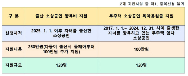 구체적으로, '출산 소상공인 양육비 지원사업'은 2025년에 자녀를 출산(배우자 출산 포함)한 소상공인에게 신생아 양육과 산후조리 비용 등으로 현금 250만원을 지급됩니다.