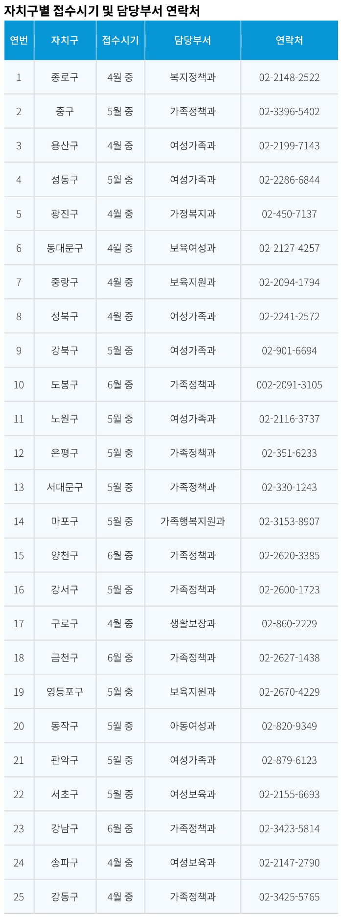 [서울 자치구별 접수시기 및 담당부서 연락처]