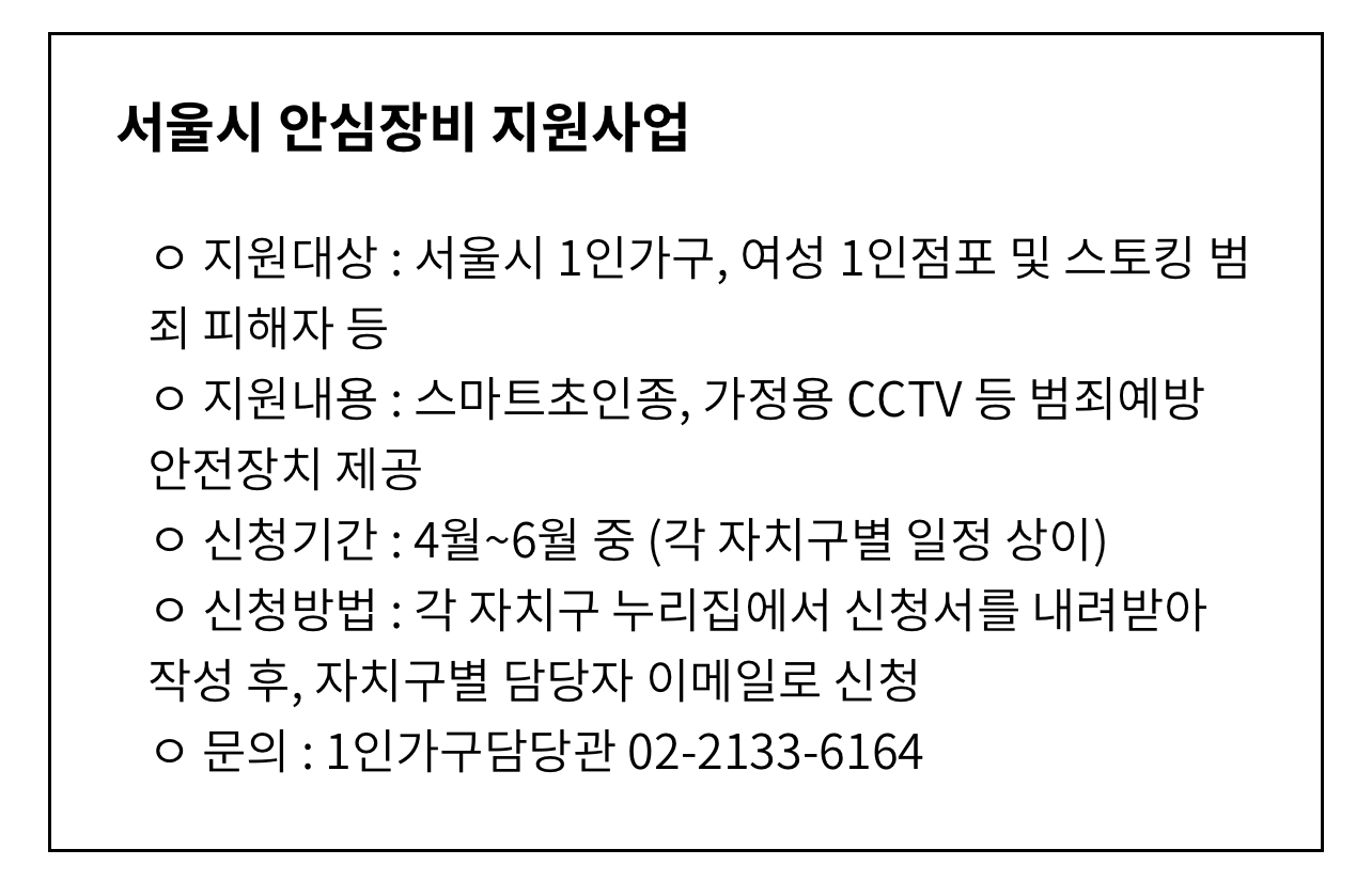 서울시가 주거침입 및 스토킹 등 각종 범죄로부터 홀로 사는 1인가구를 안전하게 지키기 위해 ‘서울시 안심장비 지원사업’을 2023년 4월 이후부터 본격 개시한다고 합니다.