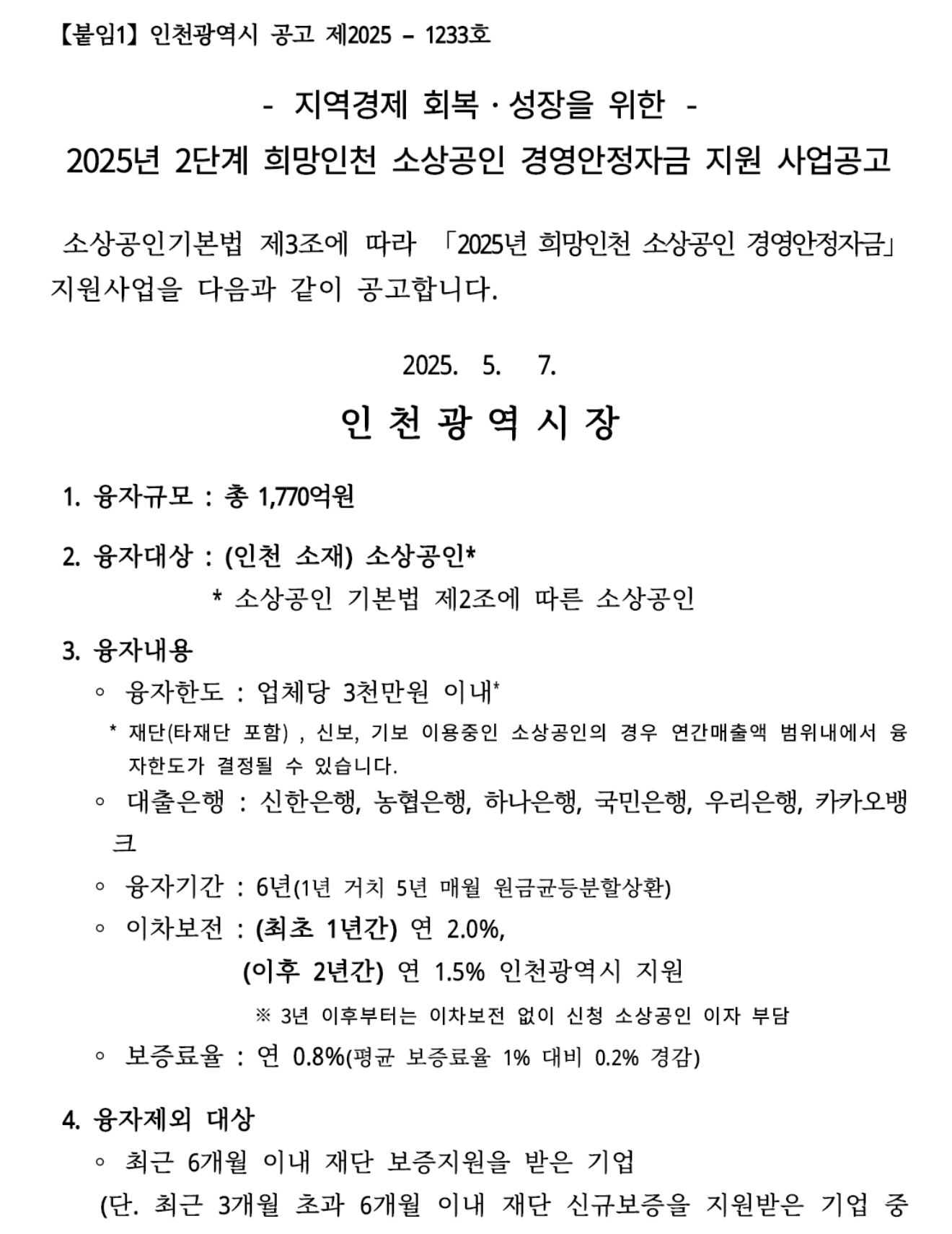 인천광역시(시장 유정복)는 2025년 5월 12일부터 소상공인의 경영안정 도모와 지역경제 회복을 본격화하기 위한 ‘2025년 희망인천 소상공인 경영안정자금 지원’ 2단계 사업을 시행한다고 밝혔습니다.