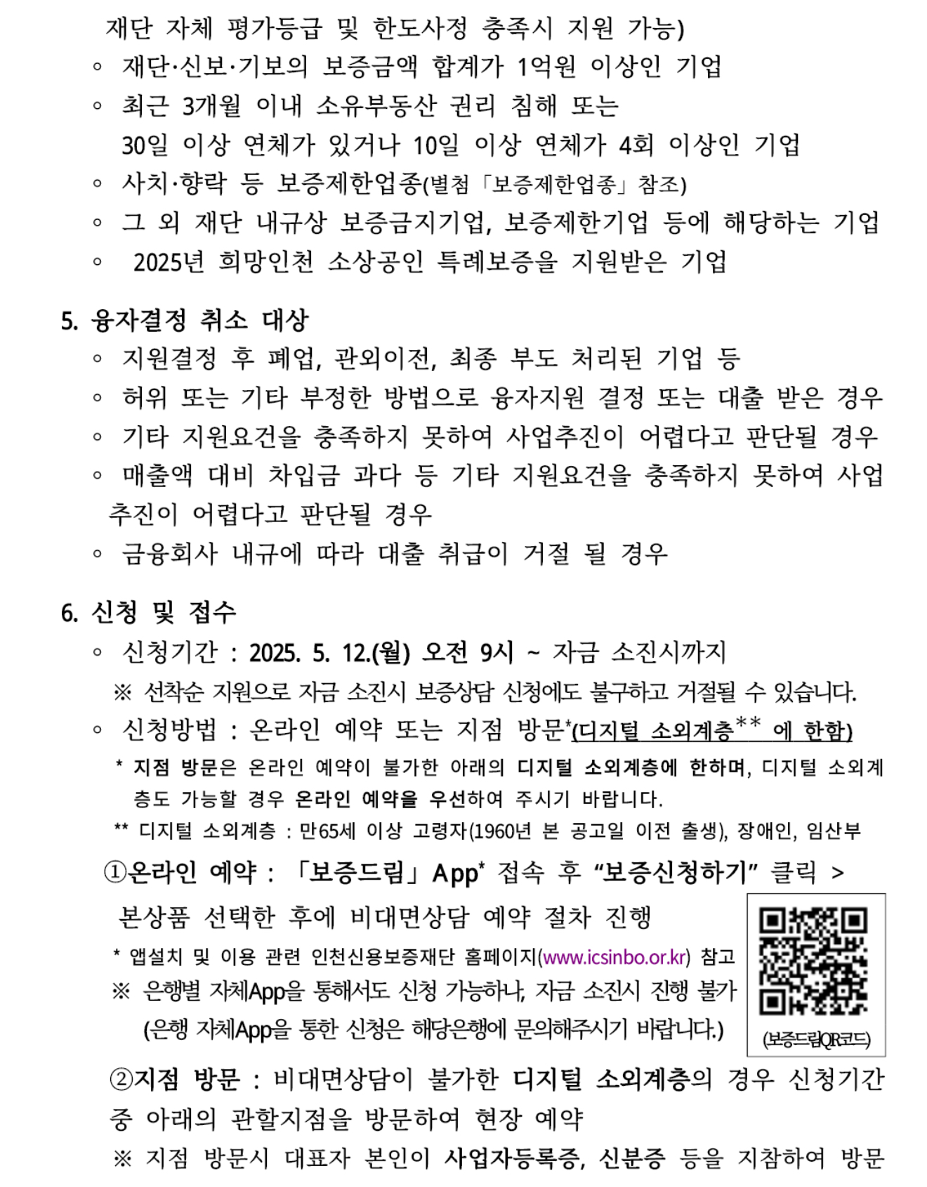 *다만, 최근 6개월 이내 신용보증재단의 보증지원을 받은 경우, 보증금액 합계가 1억 원 이상인 경우, 보증 제한업종(도박·유흥·향락·담배 관련 업종 등), 또는 연체·체납 등 보증 제한 사유에 해당할 경우에는 지원 대상에서 제외