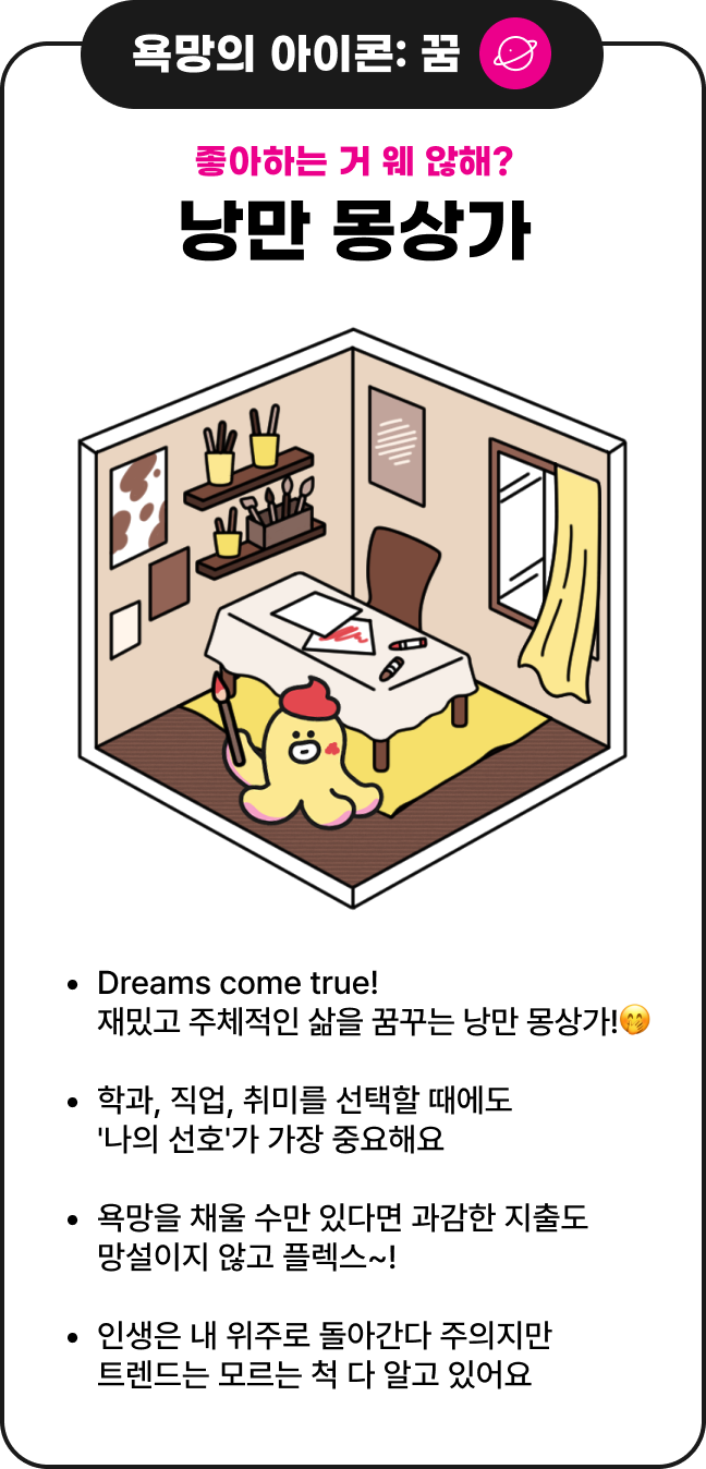 • Dreams come true! 재밌고 주체적인 삶을 꿈꾸는 낭만 몽상가!