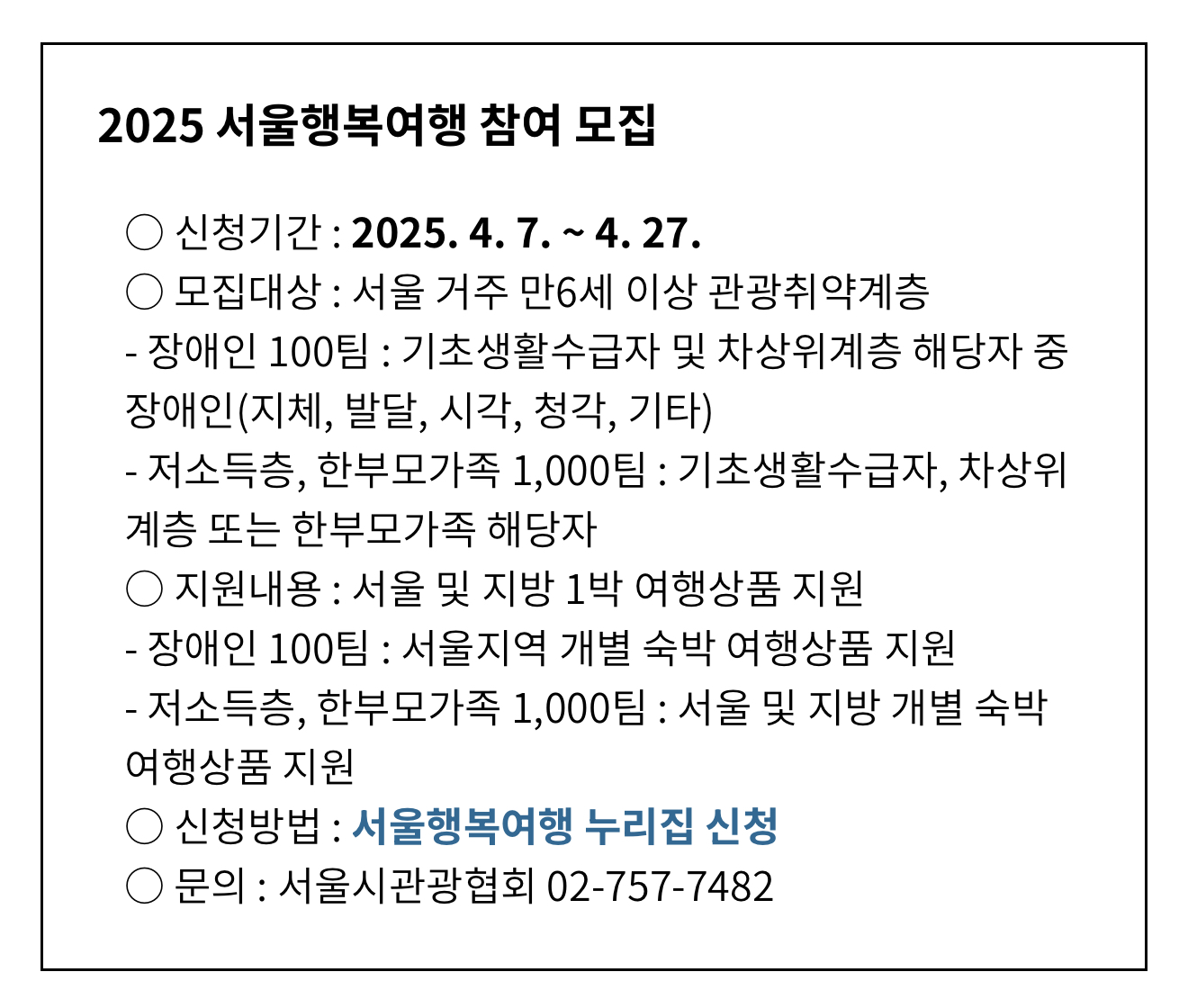서울시가 경제적‧신체적 제약 등으로 여행 기회가 적은 시민들에게 특별한 추억을 선사하고자 ‘2025 서울행복여행’에 참여할 관광취약계층 1,100팀을 2025년 4월 7일부터 4월 27일까지 3주간 모집한다고 합니다.