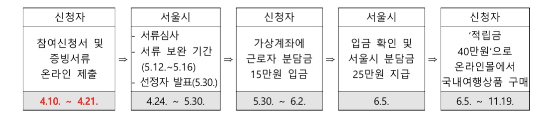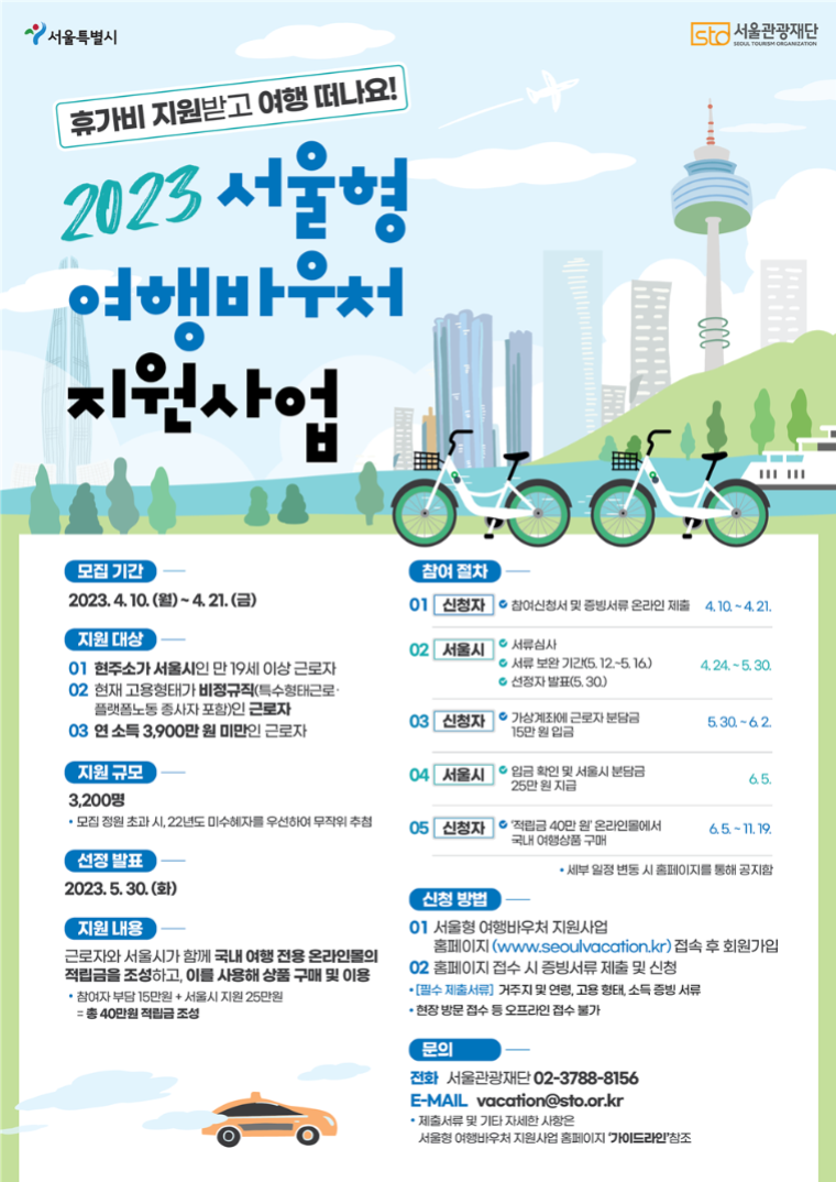 서울형 여행바우처 신청은 ① 주민등록등·초본, ② 고용형태 증빙자료, ③ 소득금액증명원 등 증빙자료를 홈페이지에 2023년 4월 10일부터 21일까지 제출하면 되고 최종 선정은 5월 30일 지원사업 홈페이지 및 개별 안내할 예정이라고 합니다.