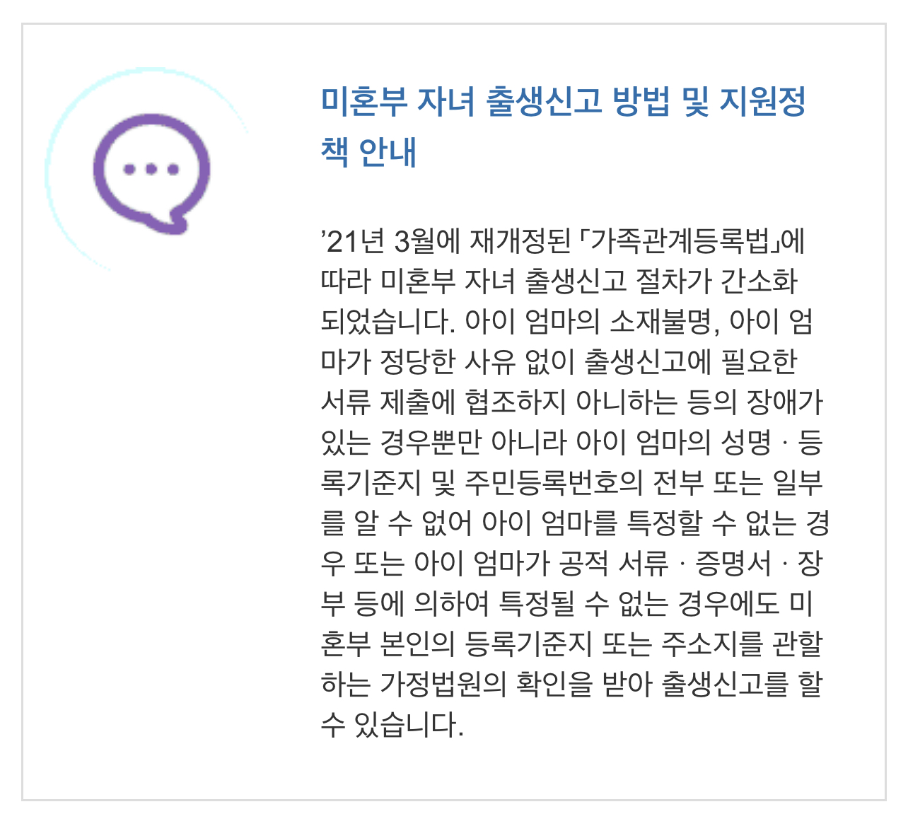 ’21년 3월에 재개정된 「가족관계등록법」에 따라 미혼부 자녀 출생신고 절차가 간소화 되었습니다.