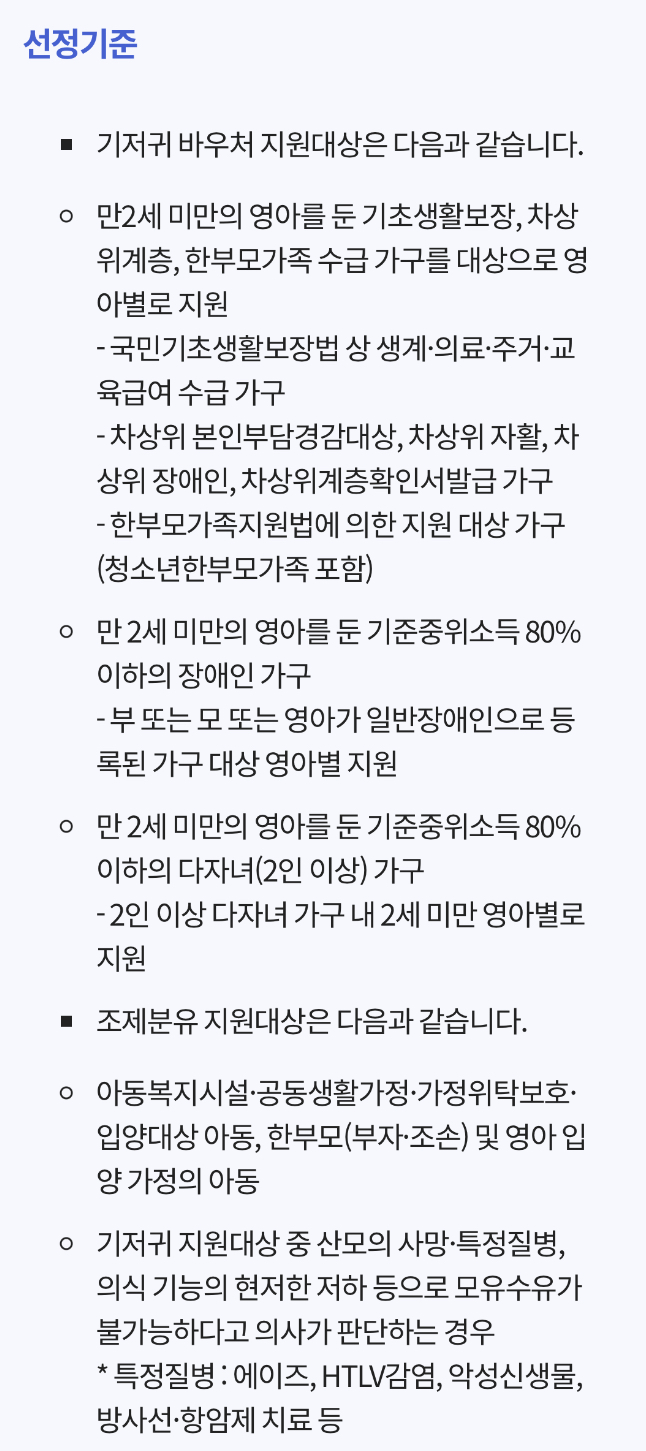 • 만 2세 미만의 영아를 둔 기초생활보장, 차상위계층, 한부모가족 수급 가구를 대상으로 영아별로 지원