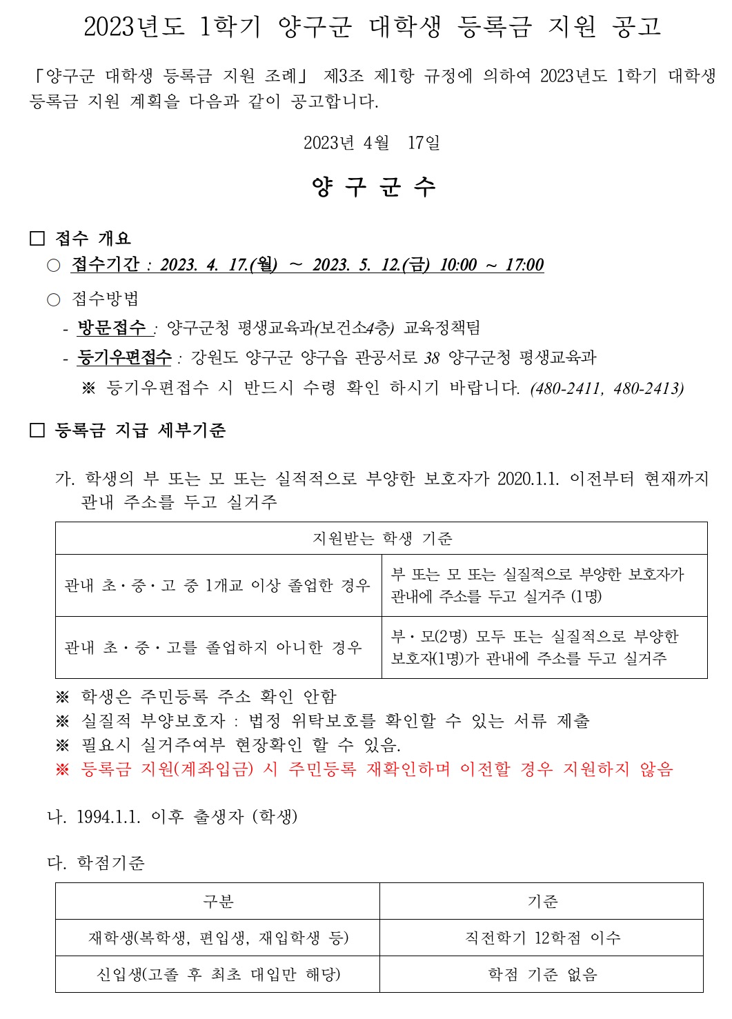 또 지원대상인 학생이 관내 초·중·고교 중 1개교 이상의 학교를 졸업한 경우 학생의 부 또는 모 또는 실질적으로 부양한 보호자가 양구군에 주소를 두고 3년 이상 계속 실거주 해야 합니다.