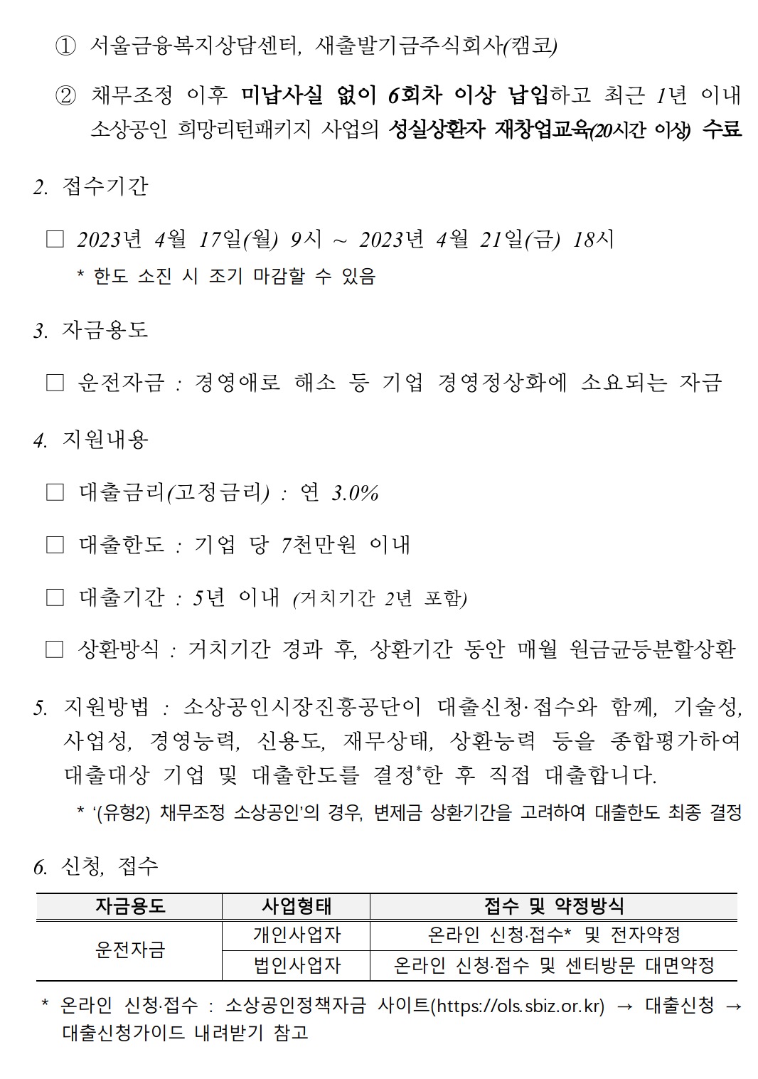 그리고 재도전특별자금 신청은 소상공인정책자금 누리집(ols.sbiz.or.kr)을 통해 접수하고 앞서 드린 설명처럼 지원금액은 최대 7천만원 한도 내에서 신청 소상공인의 신용도·사업성 및 채무조정 유형의 경우 성실상환 기간을 종합 고려하여 결정된다고 합니다.
