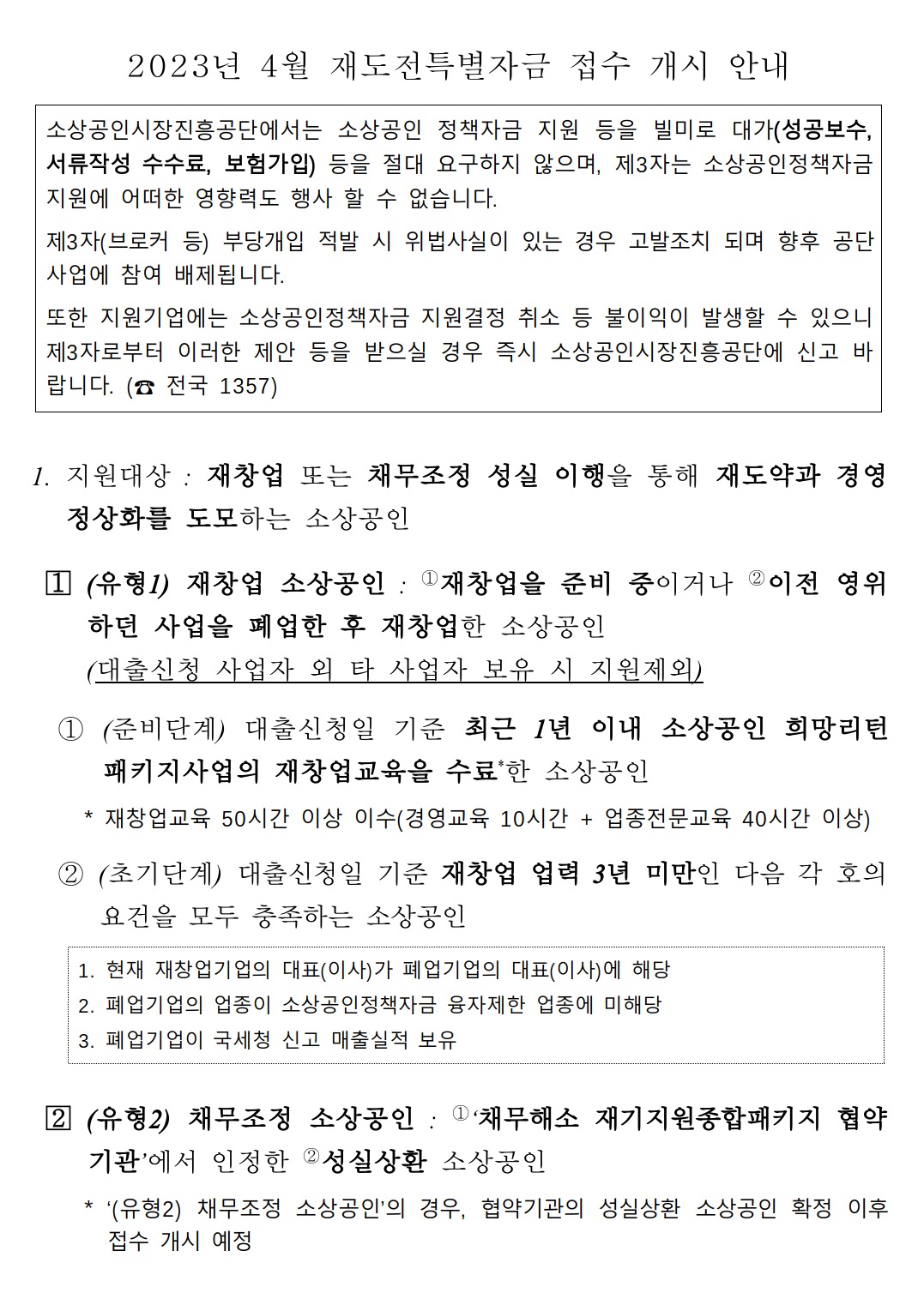 중소벤처기업부(장관 이영)와 소상공인시장진흥공단(이사장 박성효)은 2023년 4월 17일(월)부터 재창업 준비·초기 단계 소상공인과 채무조정 성실 이행 소상공인을 대상으로 ‘재도전특별자금’ 신청을 받는다고 밝혔다고 하는데 이에 상세한 설명을 드리겠습니다.