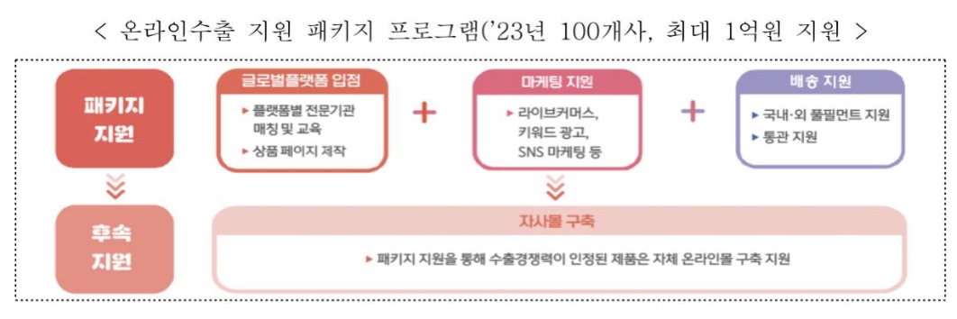 중소벤처기업부는 그간 중소기업의 온라인수출 지원을 위해 글로벌플랫폼 입점, 온라인 마케팅 지원, 물류·통관 지원, 해외향 자사 온라인몰 구축 등 다양한 프로그램을 운영해는데 다만, 각 지원 프로그램이 단절적으로 운영되어 프로그램 간 연계를 통한 시너지 효과가 다소 부족했다는 판단하에 2023년 올해 1월 발표한「중소기업 수출지원 방안」을 통해 기존의 지원 프로그램을 하나로 묶어 온라인수출 전 과정을 원스톱으로 지원하는 온라인수출 패키지 프로그램을 신설했다고 합니다.