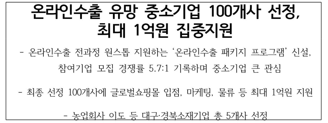 중소벤처기업부(장관 이영)는 중소기업의 온라인수출 전 과정을 집중 지원하는 ‘온라인수출 패키지 프로그램’을 신설하고 금년도 참여기업 100개사를 선정했다고 밝혔습니다.