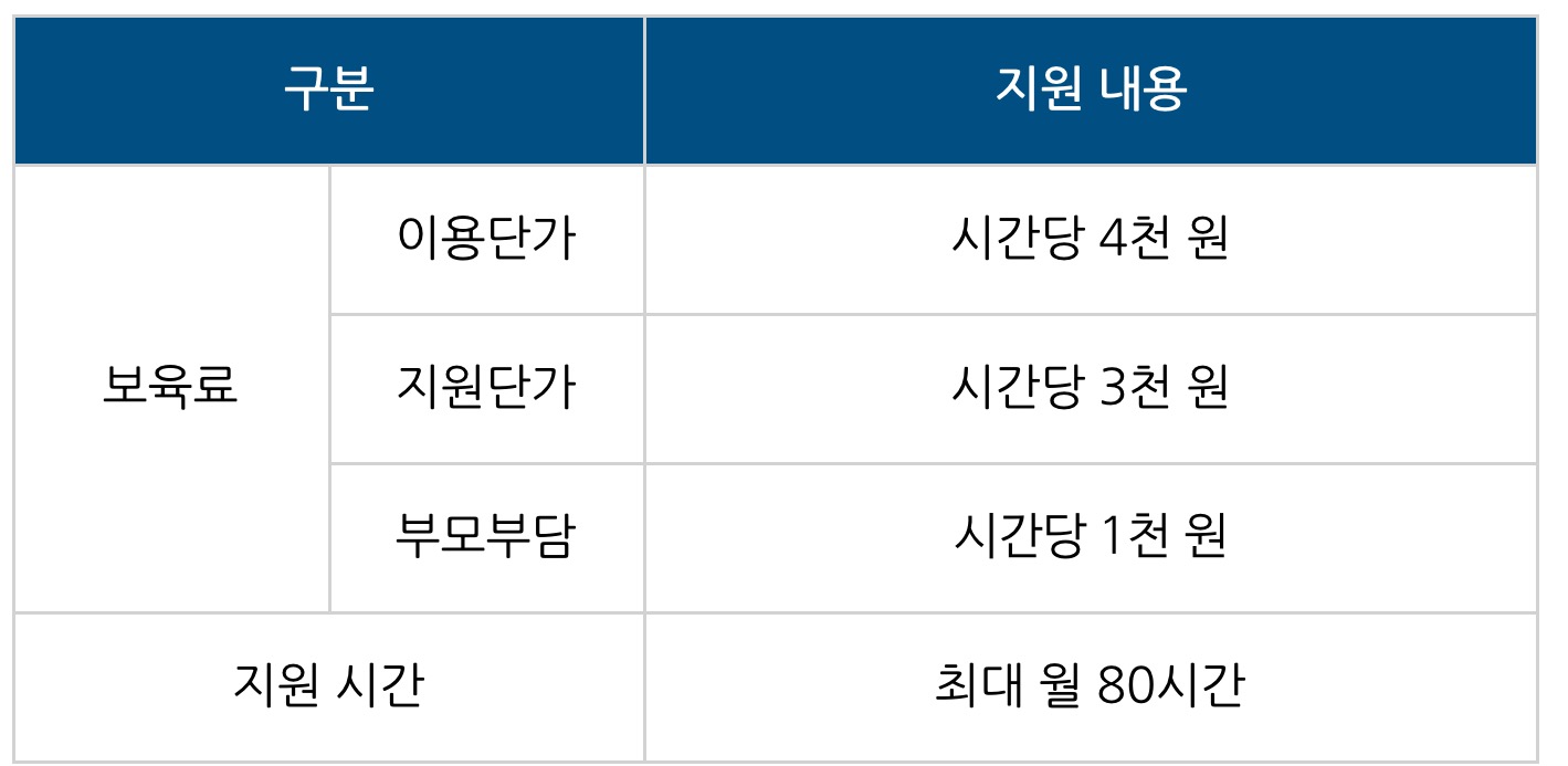 * 보육료 또는 유아학비를 지원받는 아동이 시간제 보육반을 이용할 경우에는 전액 본인 부담(시간당 4천 원)