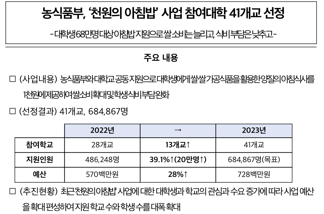 농림축산식품부(장관 정황근, 이하 농식품부)와 농림수산식품교육문화정보원(원장 이종순, 이하 농정원)은 2023년 3월 13일 ‘천원의 아침밥’ 사업 참여대학 41개소(총 목표 지원인원 684,867명)를 선정했다고 밝혔습니다.