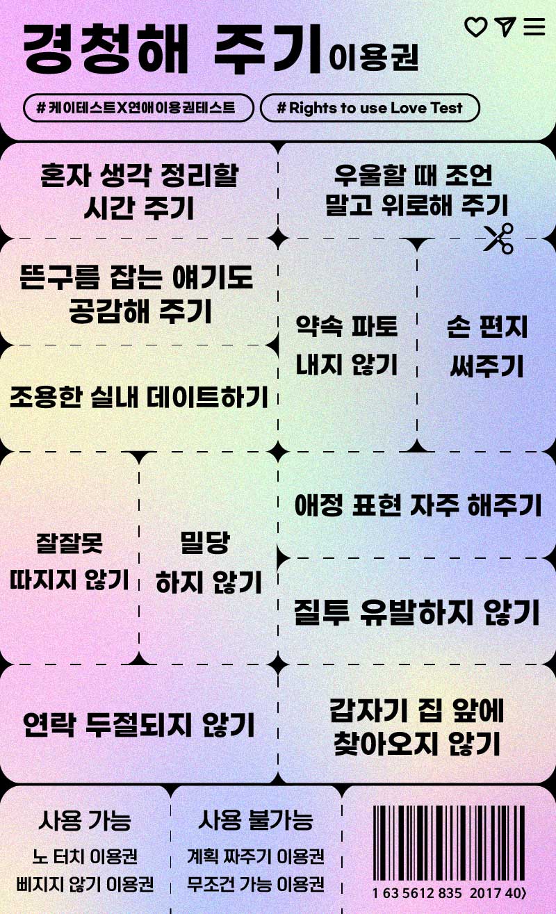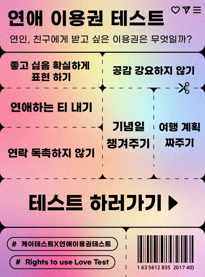이번에 케이테스트에서 또 재밌는 테스트가 등장했는데 “연인, 친구에게 받고 싶은 이용권은 무엇일까?“ 알아보는 연애 이용권 테스트가 새롭게 나왔다고 하는데 테스트 내용과 mbti 모든 유형 결과까지 정확하게 소개드리겠습니다.