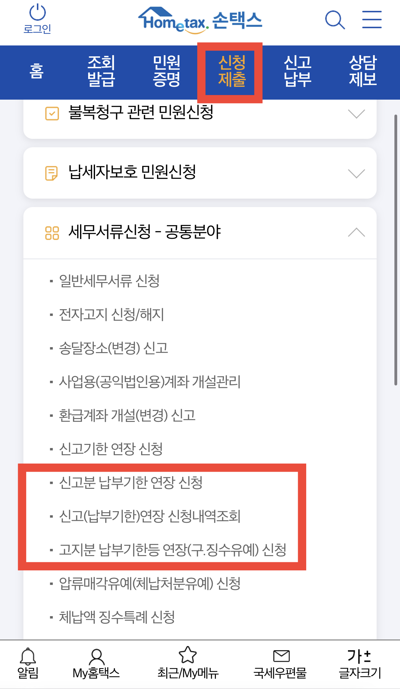 그리고 모바일에서는 손택스 > 신청제출 > 세무서류신청-공통분야에서도 예정신고납부 대상자라면 '신고분 납부기한 연장신청' 예정고지납부 대상자라면 '고지분 납부기한 등 연장(구 징수유예) 신청'에서 신청할 수 있습니다.