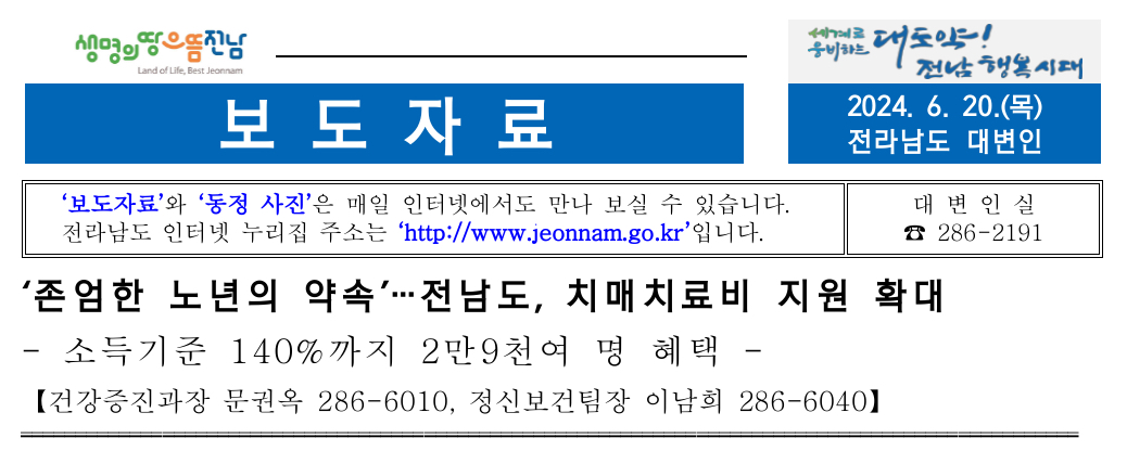 참고로 전남도는 2023년부터 3개년간 ‘전남형 치매 돌봄제’ 치매관리 종합대책을 수립해 치매를 조기 발견하고 예방, 치료하도록 종합적·체계적으로 관리하고 있습니다.