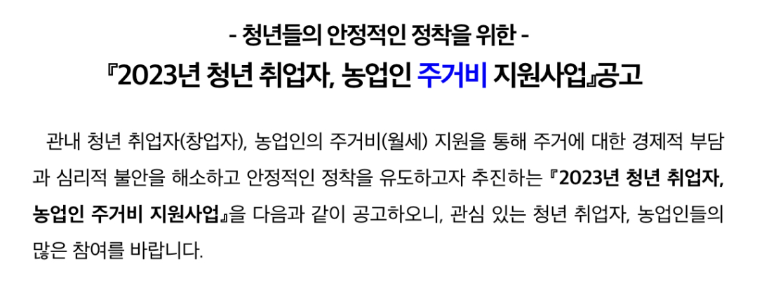 ❍ (사 업 명) 2023년 청년 취업자, 농업인 주거비(월세) 지원사업